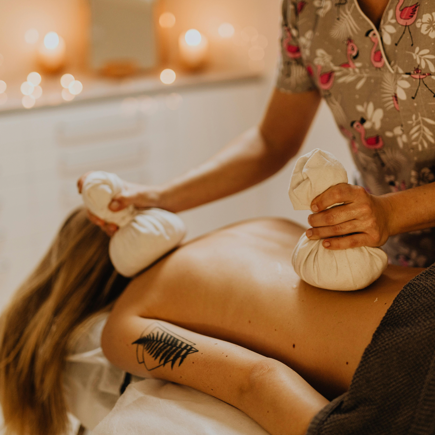 Bei der Kräuterstempelmassage werden speziell zusammengestellte Kräutermischungen in Stoffbeutel gefüllt und erwärmt. Durch sanftes Klopfen, Drücken und Ausstreichen mit den warmen Stempeln, können sich die Wirkstoffe der Kräuter freisetzen.